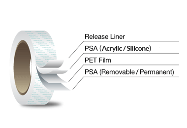 适用于不同的应用,(株)联宇的 differential胶带可大致被分类为两个系列: 一种为正反面为不同胶系(亚克力/硅胶)的胶带系列,另一种为正反面拥有不同粘合力的胶带系列。 其中,作为基材的PET薄膜保证了该胶带优秀的尺寸稳定性,大大提高了模切与加工性能